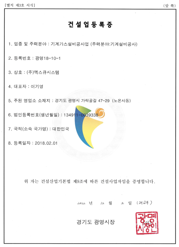 기계가스설비공사업 등록증